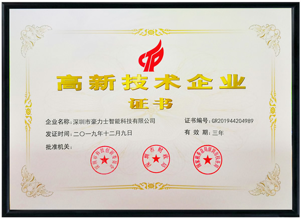 近日,深圳市豪力士智能科技有限公司正式收到由深圳市科技創新委員會頒發的國家高新技術企業認定證書,認定有效期為3年。這是豪力士智能鎖繼2016年首次獲得國家高新技術企業資質認定后,再次保持該榮譽稱號。 國家高新技